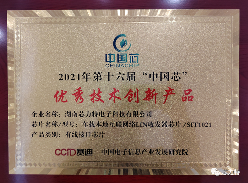 2021年12月20日,第十六届“中国芯”集成电路产业促进大会在珠海隆重召开!芯力特电子科技有限公司的【车载本地互联网络LIN收发器芯片/SIT1021】荣获“优秀技术创新产品奖”!