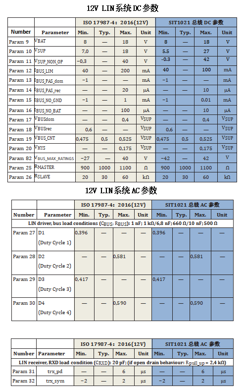 通过以上对比可知,SIT1021 LIN总线DC、AC参数完全符合ISO 17987-4-2016(12V)标准。