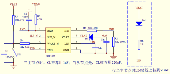 SIT1021在待机模式、正常模式和上电模式下,INH脚输出都是高电平(电压幅值与VBAT相同),只有在休眠模式下输出才是浮空状态;如果需要INH脚控制外部电源管理模块,则需将此脚通过电阻下拉到地看,如下图,考虑到功耗,下拉电阻R2推荐使用100K(如果电源管理模块使能脚内部未接下拉电阻,则需要外接下拉电阻,如果内部有接下拉电阻,则可根据实际应用来决定是否外部加下拉电阻);可根据电源管理模块使能脚耐压,调节R1和R2的阻值,以调节输出到电源管理模块的使能脚电压。如果不用此功能可以通过电阻上拉到VBAT,或者悬空。应用时应注意,芯片上电后,需将SLP_N脚置高使芯片进入正常模式后,才能将其设置在休眠模式,如上电后直接将SLP_N脚置低,则无法进入休眠模式;另外休眠模式与正常模式可以通过设置SLP_N脚来回转换;如果在休眠模式下,通过本地唤醒或者远程唤醒后,SIT1021先进入待机模式,同时RXD输出唤醒标志(置低),TXD输出唤醒源标志(置低(弱下拉代表远程唤醒,强下拉代表本地唤醒));当MCU检测到唤醒标志后,通过唤醒源标志检测到唤醒源,控制SLP_N置高,进入正常模式,接收数据。