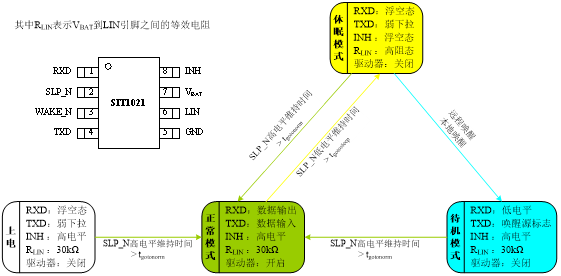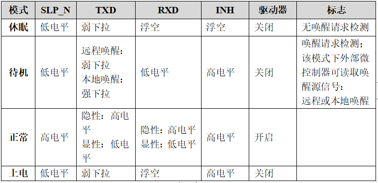 SIT1021工作在各模式下,相关引脚状态如下表: