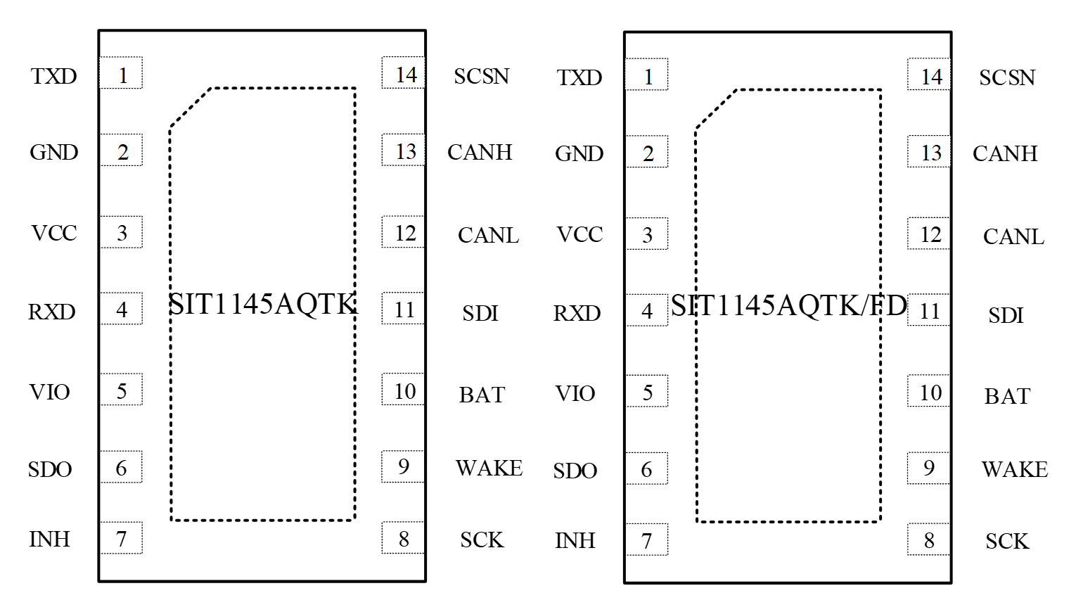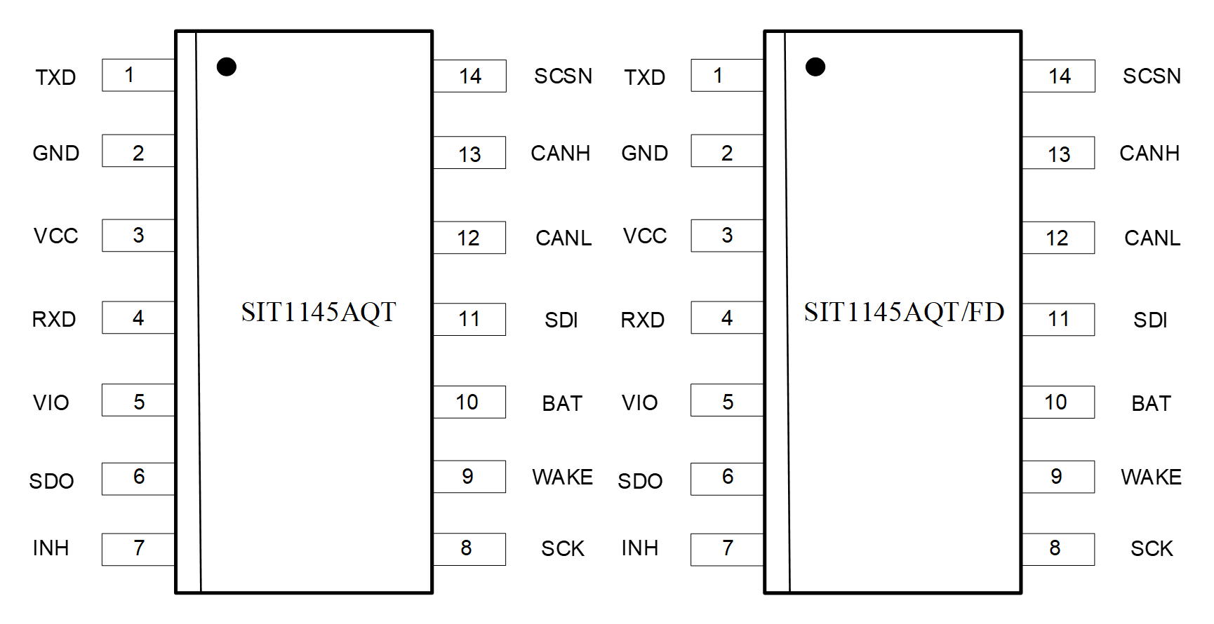 SIT1145AQ总线端口耐压可达-58V至+58V,接收器共模输入电压达到-12V至+12V,VBAT工作电压5.5V~40V, 耐压可达70V, 适用于 12V 或 24V 应用系统。