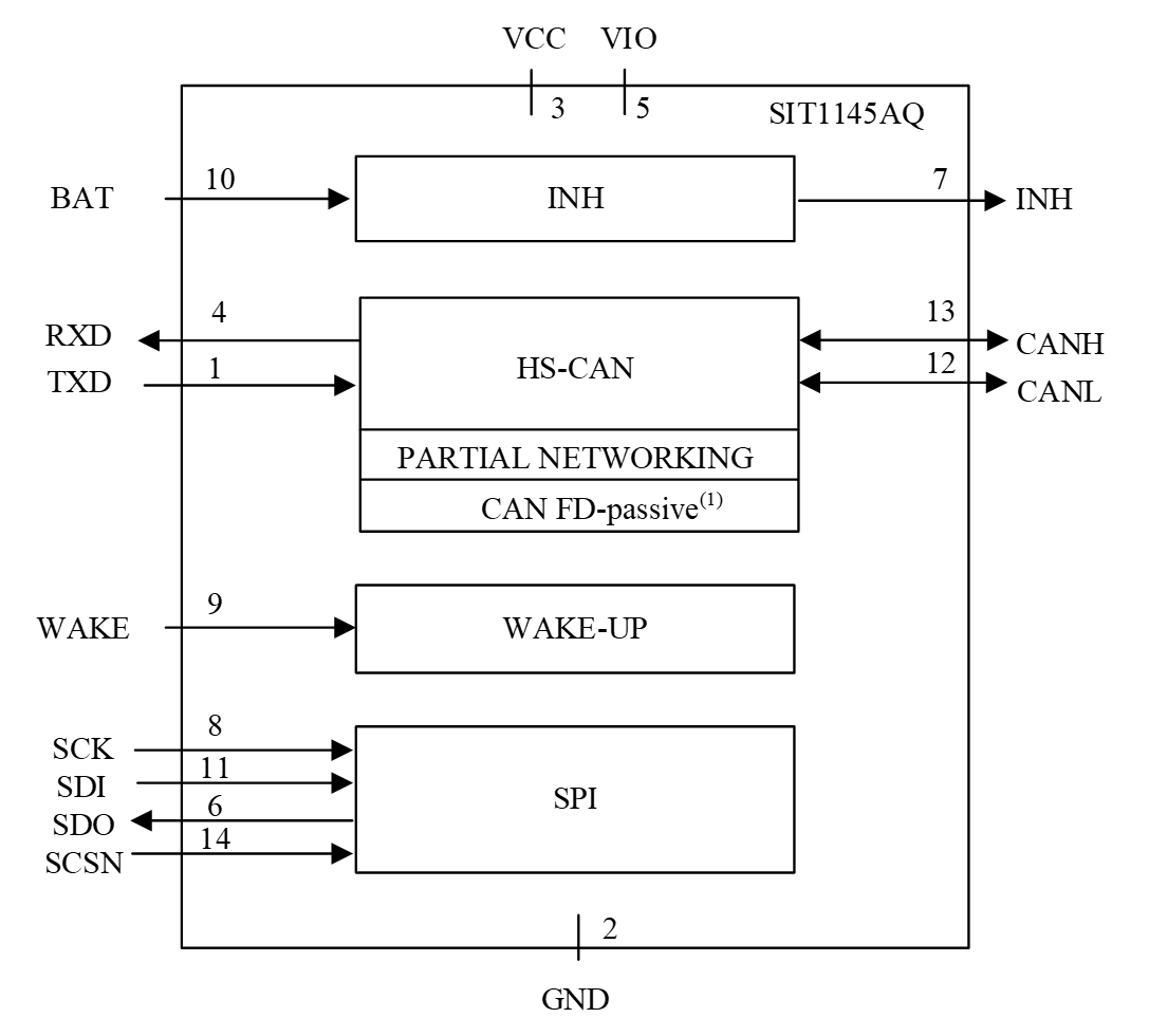 SIT1145AQ拥有五种工作模式:正常工作模式、静音模式、待机模式、睡眠等待模式和睡眠模式。除了有本地唤醒、远程唤醒(任意帧唤醒)外,还可以通过SPI设置SIT1145AQ为选择性唤醒。通过设置芯片内的寄存器来设置唤醒帧的范围,进入睡眠模式后,需要总线上有匹配波特率并符合设置的唤醒帧范围的报文才会唤醒SIT1145AQ,有效减少了主控芯片的唤醒次数和资源占用,极大节省 CAN 总线应用系统的电力和节点功耗。SIT1145AQ带INH脚功能,能够控制给系统供电的LDO,使系统在休眠模式下关闭LDO输出,实现整板休眠达到最低功耗,以满足客户的更低功耗需求。