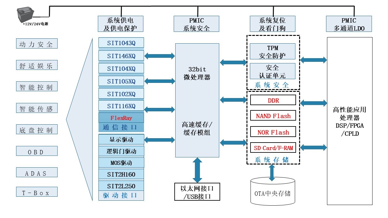 随着电子技术的发展,汽车也趋向于电动化、自动驾驶化与服务导向型汽车,汽车分布式网络(具体如图5所示)也已经随之而生。SIT1043Q优秀的性能获得了众多知名客户的认可,属于公司开发的第三代高速CAN FD收发器,支持多种模式的超低功耗,高性能,高抗干扰性,使之成功应用于车身控制器:如车载网关,车载域控制器、整车控制器等。同时在车载低功耗CAN网络应用领域,SIT1043Q成功应用于:车充及BMS、智能座椅、智能门窗、后视镜及照明等应用。