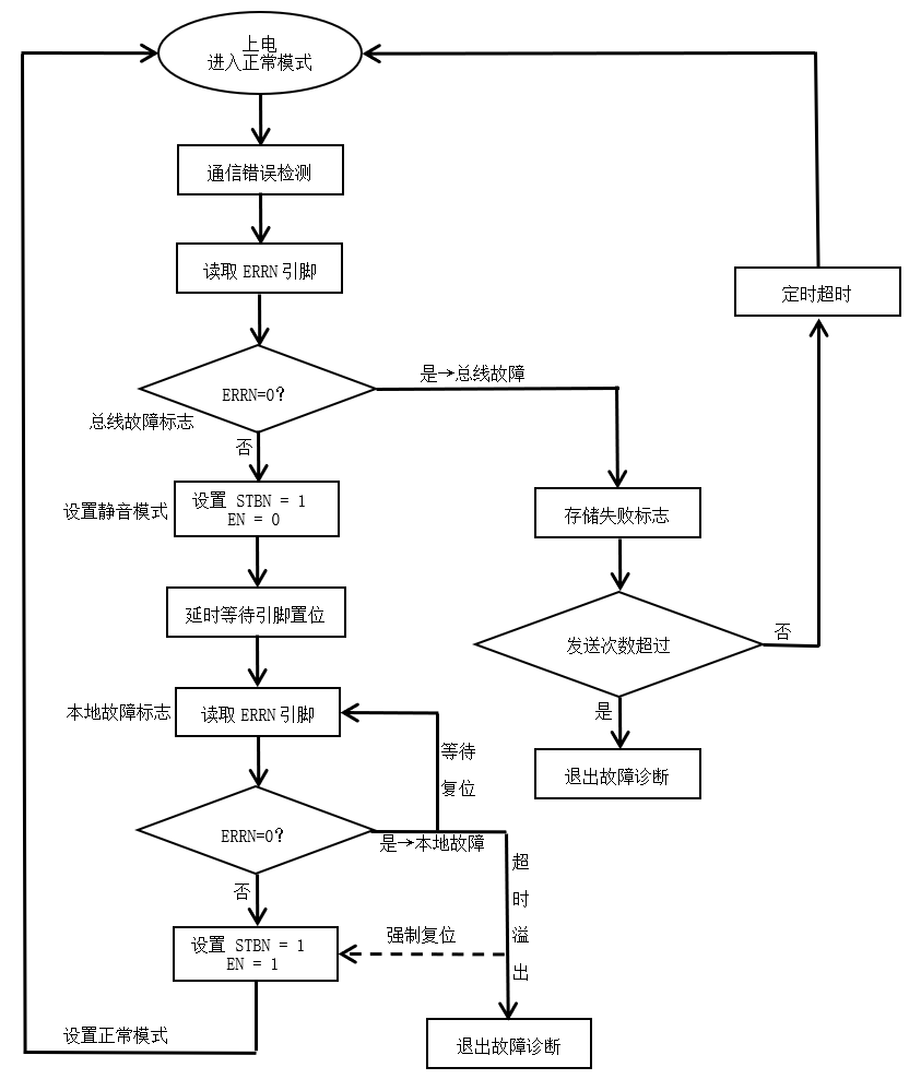 ECU节点上电启动后SIT1043Q进入正常模式,在正常模式下MCU微控制器通过读取引脚ERRN电平,来进行总线故障诊断。如果获取到ERRN=0,则通信故障是由总线故障引起,MCU控制器置位总线故障通信失败错误标志。如果获取到ERRN=1,则控制器复位总线故障通信失败错误标志。这时如果MCU控制器强制SIT1043Q进入到静音模式,在静音模式下,如果控制器获取到ERRN=0,则可以诊断位本地故障。如果进一步获取本地故障的哪一个类别(比如TXD显性超时或总线显性超时),可以由控制器操作RXD=0&TXD=1或者RXD=1进一步识别。