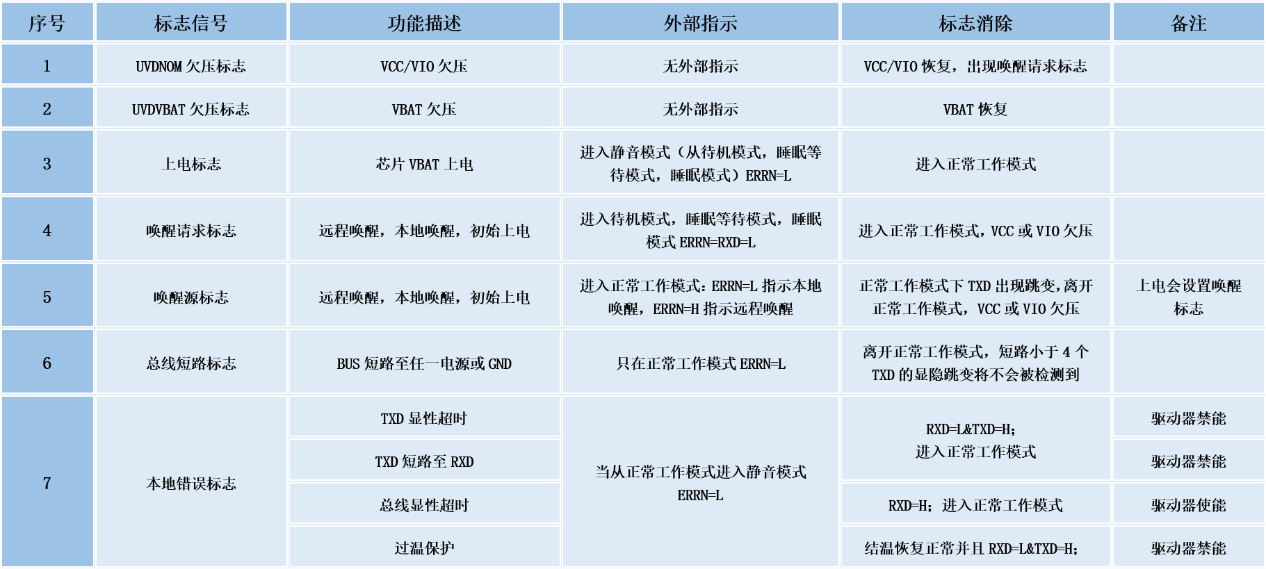 SIT1043Q使用7个内部标志来实现故障安全的回退模式控制和系统诊断。主控制器可以通过引脚ERR_N轮询其中的五个标志,功能标志执行操作如下表1所示。