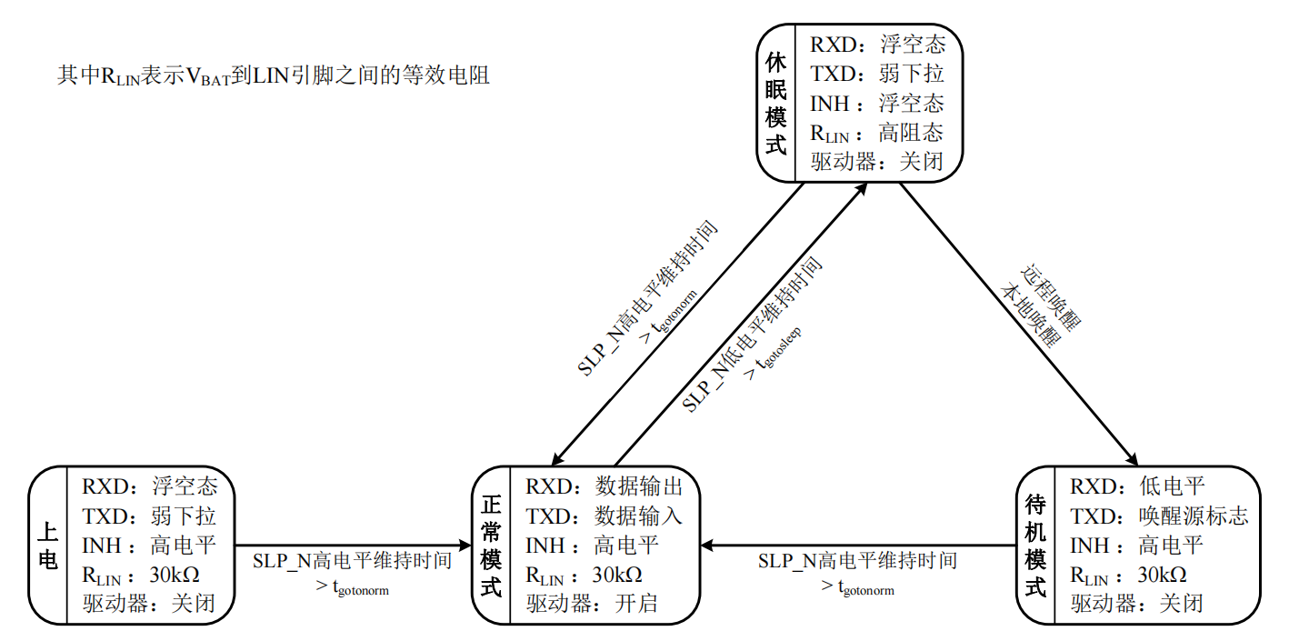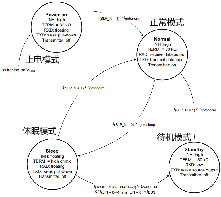 另外,SIT1021与TJA1021工作模式之间的切换一致,两款收发器的工作模式之间的转换示意图如下: