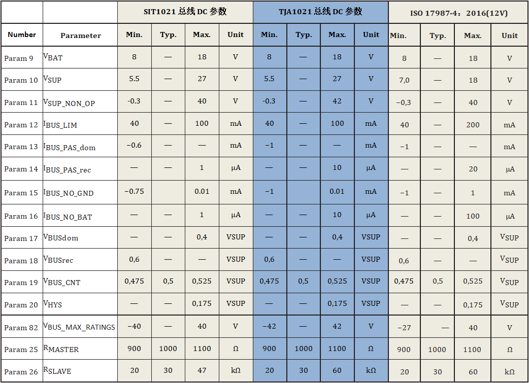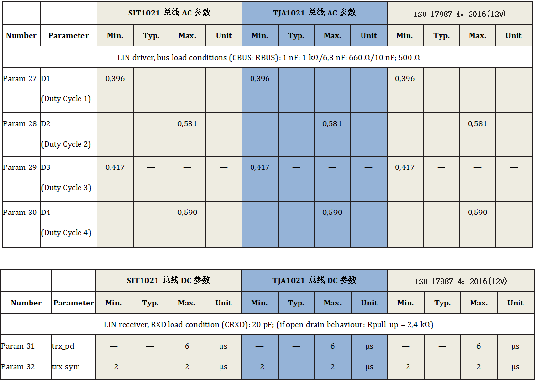 两款LIN收发器的DC参数及AC参数均符合 LIN 2.0、LIN 2.1、LIN 2.2、LIN 2.2A、ISO 17987-4:2016 (12V) 和 SAE J2602 标准,如下表: