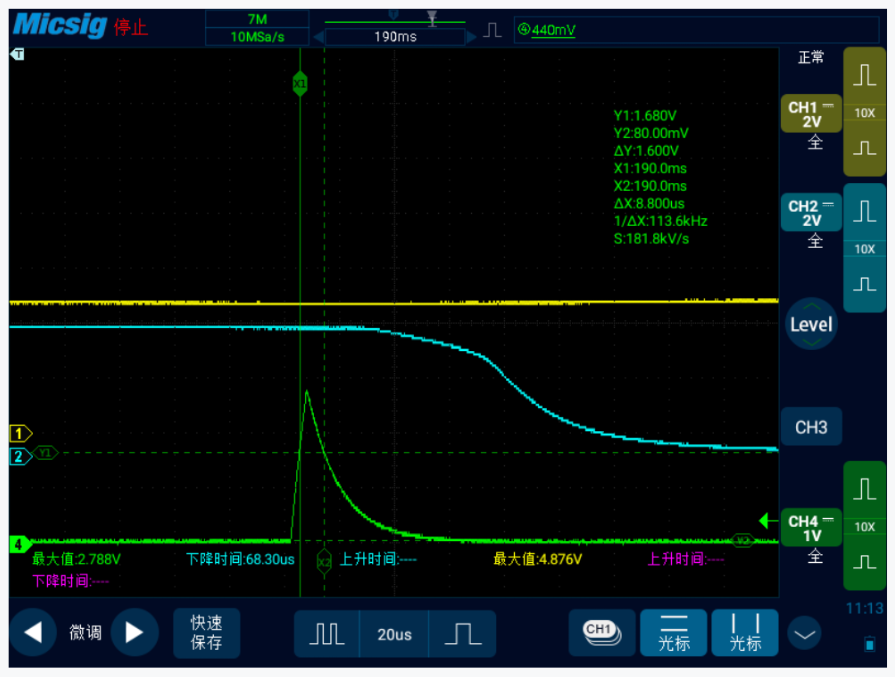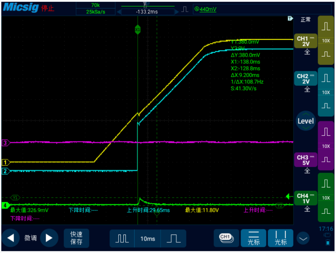 干扰幅值(绿色通道)由原来的2.8V降低为0.33V左右,此时INH(蓝色通道)输出高,各功能均能正常工作。