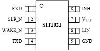 SIT1021具有超低功耗休眠模式,芯片在休眠模式下,流过VBAT脚电流典型值仅为3uA;SLP_N脚控制芯片进入正常工作模式和休眠模式,当SLP_N脚为高电平时,芯片进入正常工作模式;当SLP_N脚为低电平时,芯片进入休眠模式;SLP_N脚内置弱下拉(国外同类芯片一样内置弱下拉),较容易受外界干扰影响,上电后用手触摸此管脚能够引起芯片进入正常工作模式;这样如果在干扰比较强的应用环境中SLP_N端口可能会受干扰被误触发,造成功能不良。SIT1021管脚图如下: