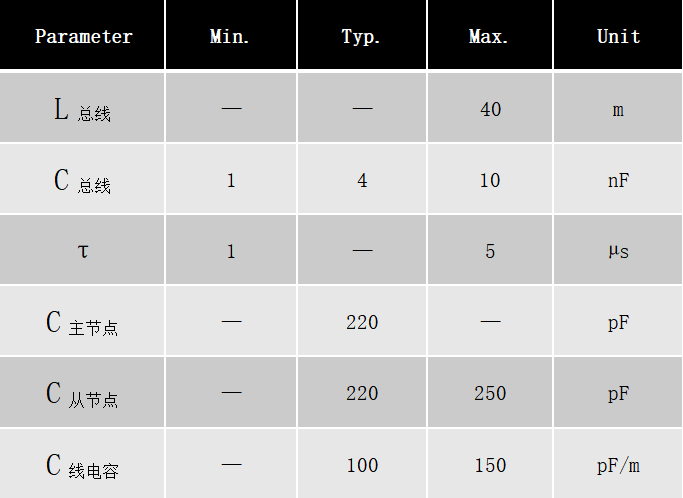 在设计时,需要根据总线长度和节点数来确定C主节点 和C从节点 ,最终将时间常数设置在1~5us内。例如:总线长16米,节点3个,C从节点=220PF,R主节点=1000Ω,R从节点=30K,可根据已知参数确定C主节点;